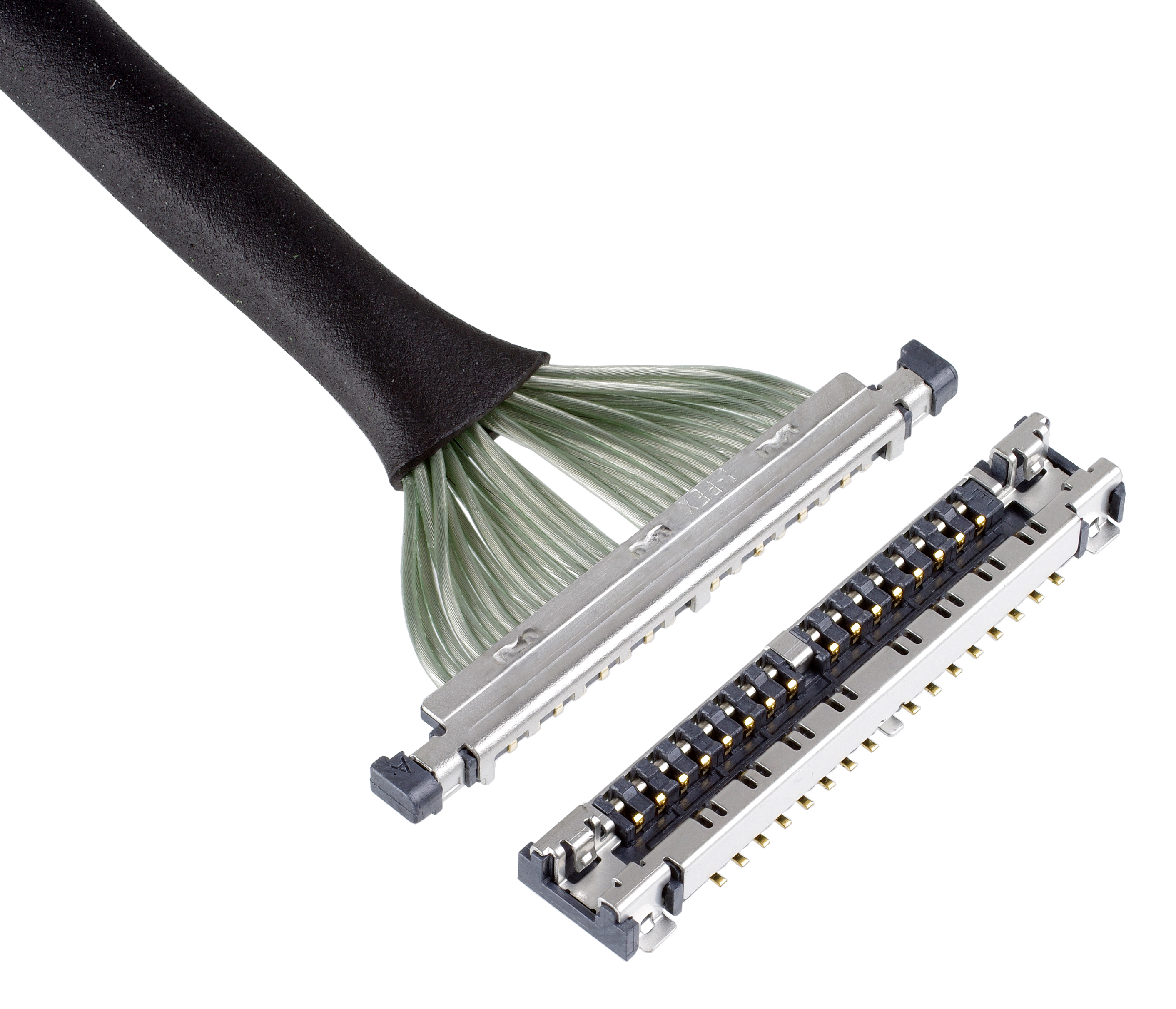高周波信号は一般的にアンテナ、高速基板トレース、PCB上のトランシーバーなど、通信源の近くからの電磁波の影響を受けやすくなっています。細線同軸ケーブルを使用することで、これらの高速信号はノイズから十分に保護され、データのシグナルインテグリティが保たれます。細線同軸ケーブルは、絶縁のための誘電体コアに囲まれた信号伝送用の中心導体を含みます。グランドリターン電流のために複数の撚り線を持つ外側の金属ジャケット、さらに絶縁用にジャケットがあります。I-PEXは高周波信号用のフルシールドコネクタと、高い接続信頼性を保持するメカニカルロック機能(オプション)とともに完全な細線同軸ケーブルハーネスソリューションを提供します。