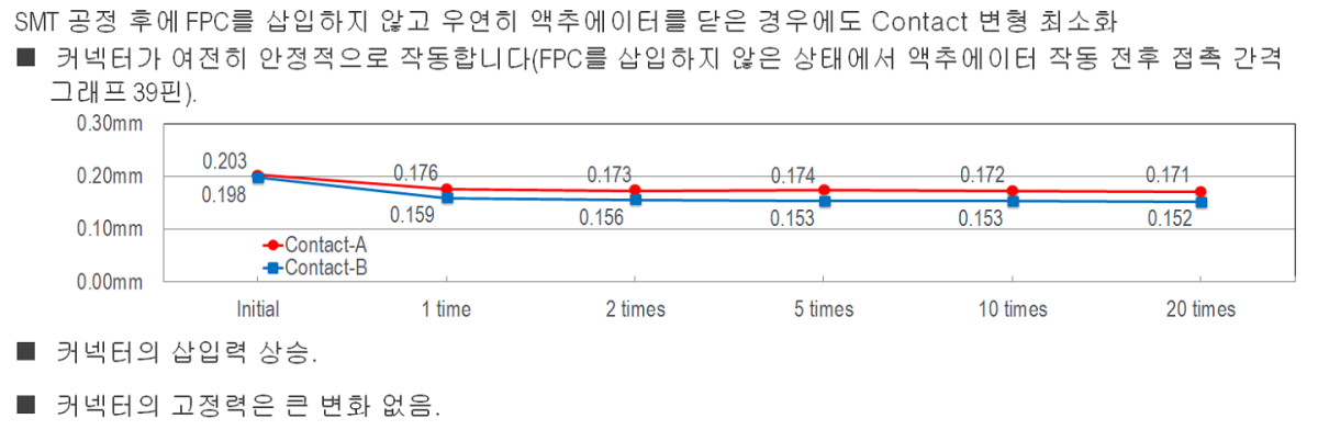TSMT 공정 후에 FPC를 삽입하지 않고 우연히 Actuator를 닫은 경우에도 Contact 변형 최소화 ■ Connector가 안정적으로 작동합니다(FPC를 삽입하지 않은 상태에서 Actuator 작동 전후 Contact 접점간 치수 그래프 39Pin)